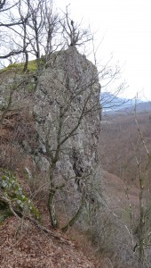 Vychádzame z obce Brehy 248 m, ktorá je časťou mesta Nová Baňa žltou turistickou značkou lesnou cestou ku kameňolomu. Asi po 100 m prídeme na Slosberg 363 m, kde sa napojíme na zelenú značku a v stálom stúpaní prídeme do sedla Krížny buk 618 m. Je to sedlo s porastom mohutných bukov na hlavnom hrebeni Hodružskej hornatiny. Odtiaľto pokračujeme vpravo modrou značkou, až vystúpime na vrchol Ťatiara 734 m. Ďalej pokračujeme na Agraš 734 m, s výhľadmi do údolia Hrona. V miernom klesaní obchádzame Ostrý vrch 633 m a lúkou prejdeme popod elektrické vedenie, až prídeme do sedla pod Rakovcom. Tu sa k nám pripája zelená značka z Devičian a spolu s ňou vystúpime cez Rakovec 630 m na vrchol Priesila, ktorý má vlastne dva vrcholy. Malý Priesil 714 m, a vlastný 748 m. Z vrcholu je výhľad do údolia Hrona. Zostupujeme zelenou značkou klesajúcim hrebeňom k nepatrným zvyškom hradu Breznica a bočným hrebeňom strmou stráňou zostúpime do obce Tekovská Breznica 200 m, ktorá leží na oboch brehoch Hrona.